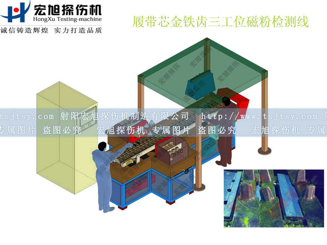 雙電極箱可調(diào)極間距,滿足各種尺寸履帶芯金鐵齒在一臺熒光磁粉探傷機(jī)上可通用檢測。